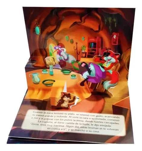 Sumérgete en esta fábula clásica de Esopo como nunca antes: La zorra y la cigüeña cobra vida en tridimensional con escenas pop-up deslumbrantes. Desde la invitación invitadora y engañosa de la zorra hasta el delicado festín de la cigüeña, cada página revela una historia visual que enseña una valiosa lección sobre la reciprocidad y el respeto.